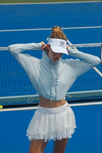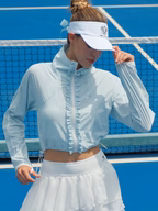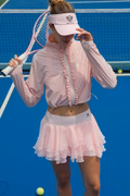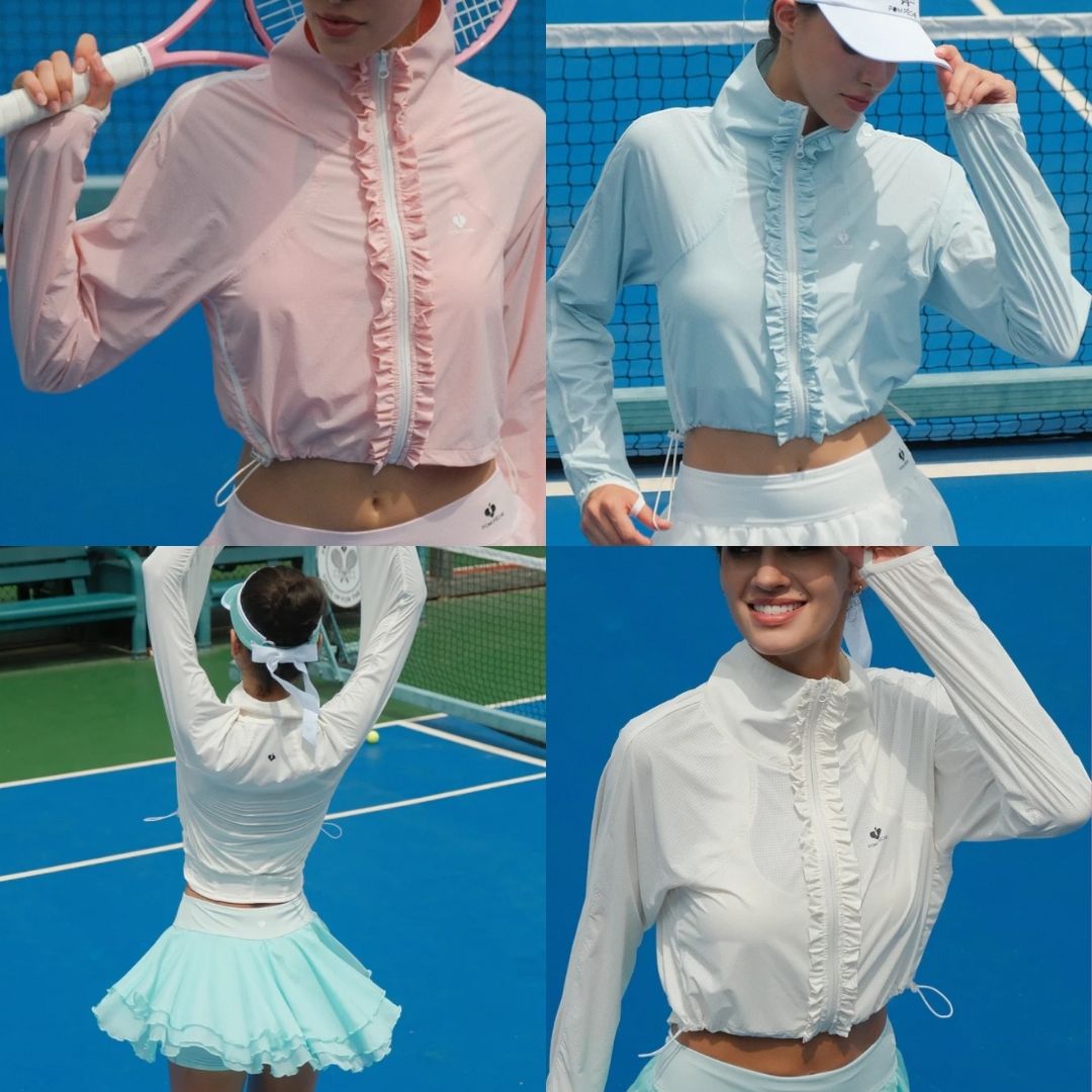 - Look thể thao: Áo khoác AirShield + bra thể thao + chân váy Pickleball + sneaker trắng