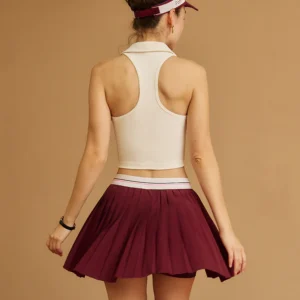 Sự kết hợp áo và chân váy cùng tông màu tạo nên tổng thể hài hòa, vừa thể thao vừa nữ tính.